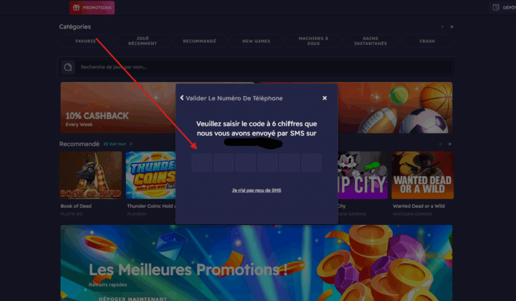 Le casino va vous envoyer un SMS contenant un code de vérification à 6 numéros Que vous inscrirez dans les champs requis.