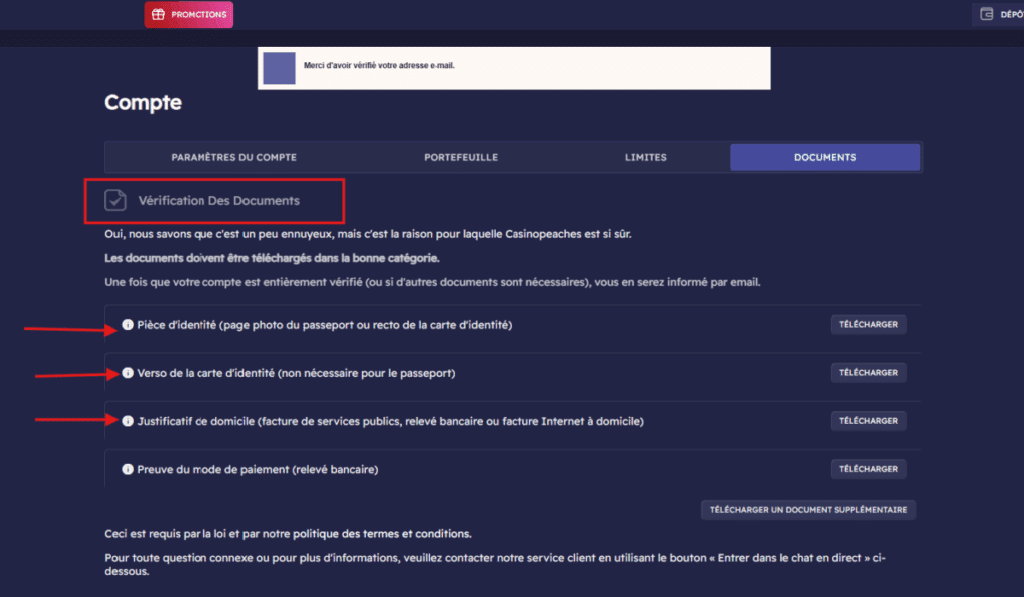 ℹ️ Avant de réaliser le premier dépôt, le casino exigera de vous vos documents d’identité et un justificatif de domicile. Ils sont facilement téléchargeables via votre compte joueur. (Procédure KYC commune à tous les casinos en ligne sous licence).